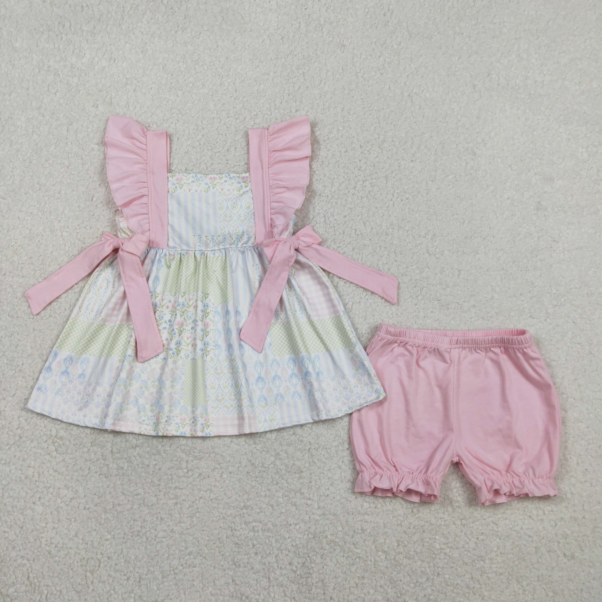 Baby Girls Short Sleeves Floral Bows Tunic Pink Shorts Clothes Set RTS