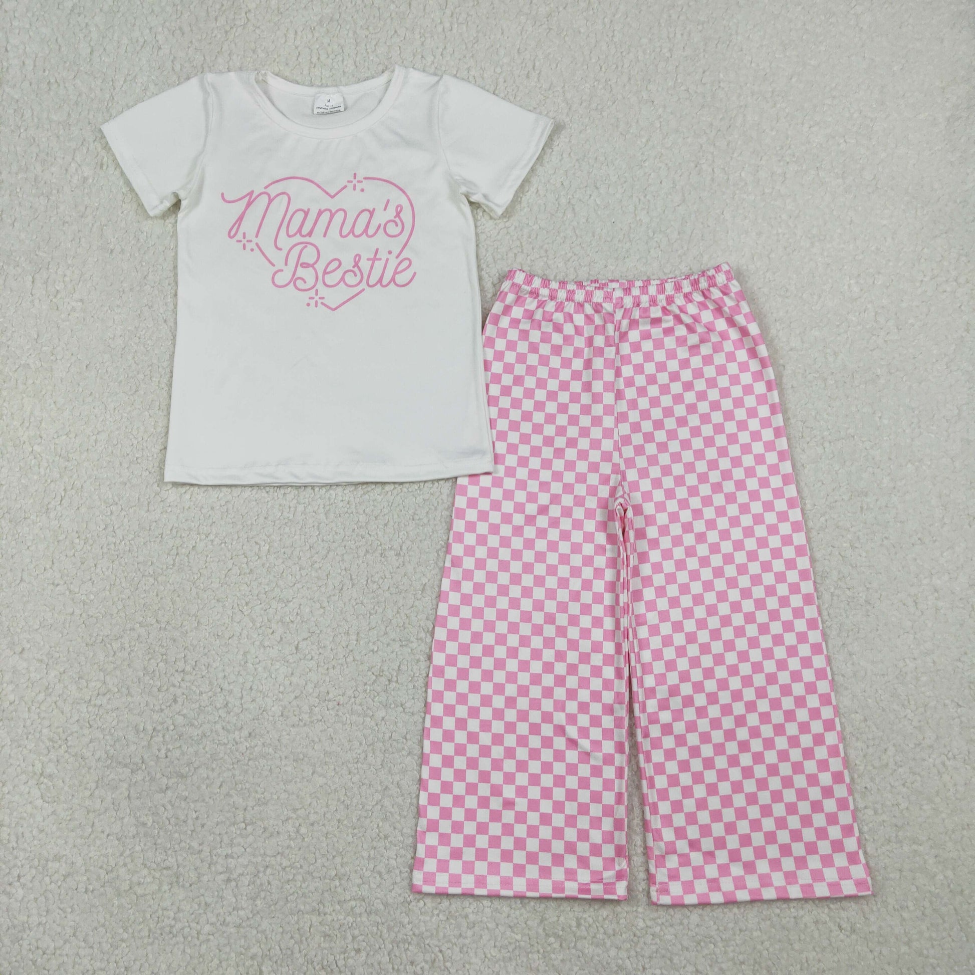 RTS Baby Girls Short Sleeves Mama's Bestie Heart Shirt Pink Plaid Pants Clothes Set