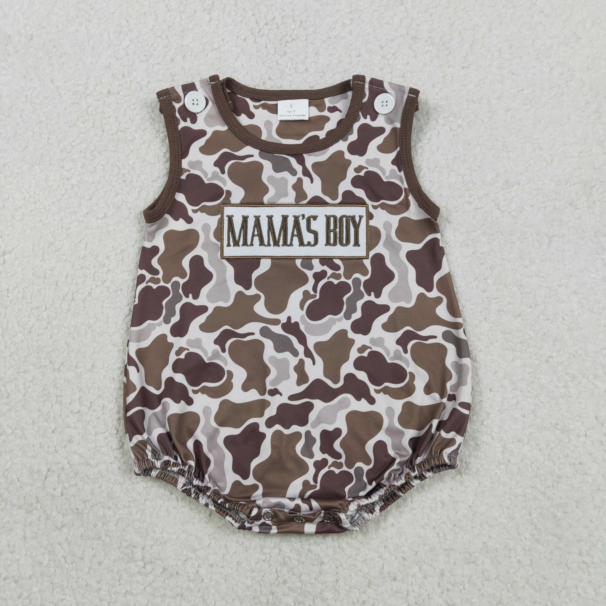 RTS Baby Kids Sleeveless Embroidery Mama's Boy Brown Camo Bubble Summer Romper